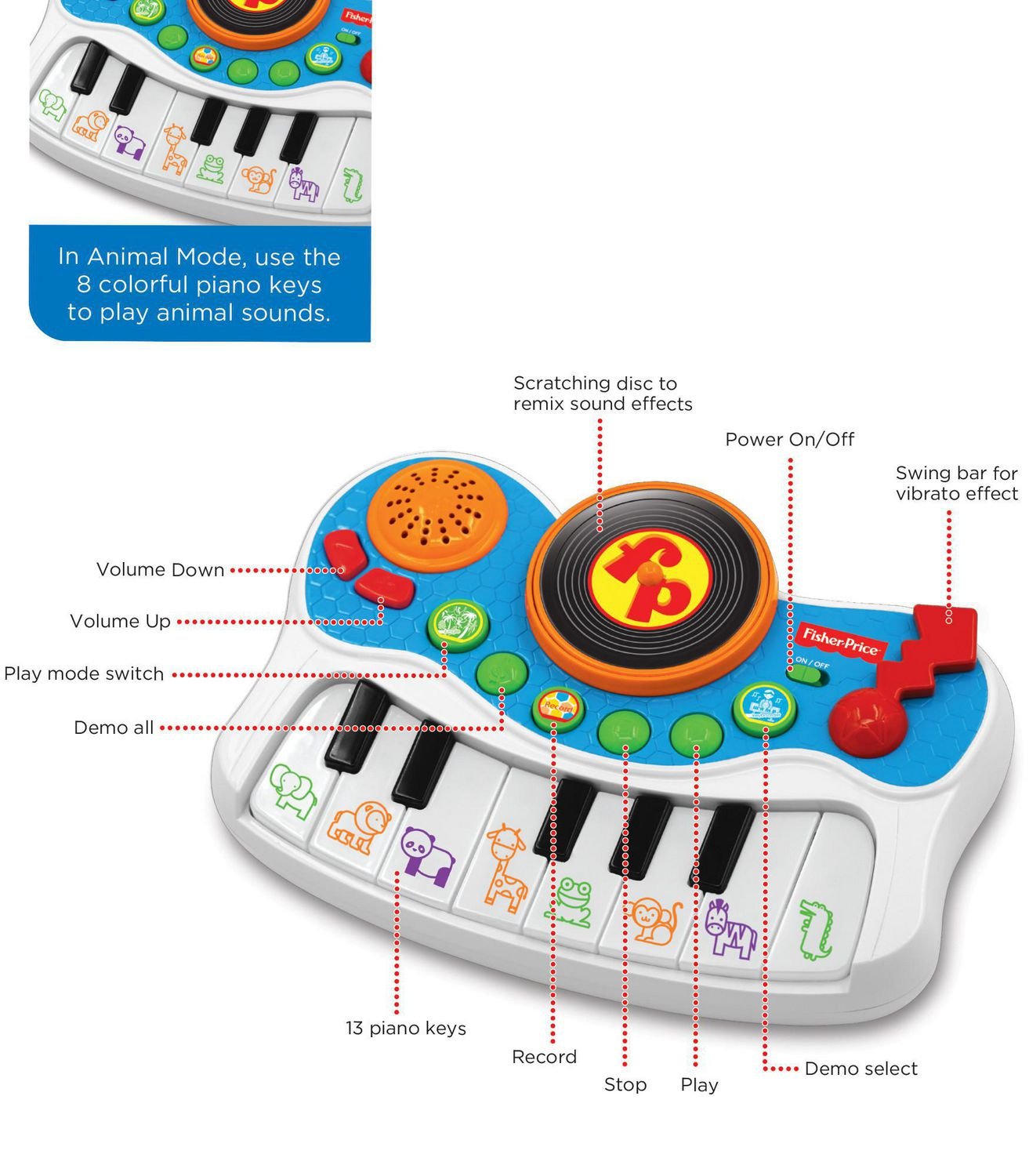 • 24 mois et plus • Batterie incluse• Mode essai• 22 morceaux de démonstration• Contrôle du volume et 5 tempos réglables.• 5 effets d’instruments• Prenez le micro et chantez !• Enregistrer et lire pour écouter votre propre chanson• Les couleurs du produit peuvent varier de celles qui sont illustrées
